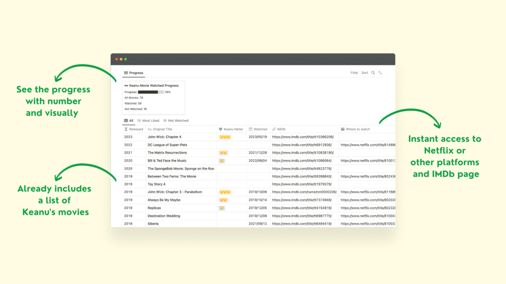Elevate your movie-watching experience with this simple template that already includes a list of Keanu's movies. π₯β¨ Just mark the ones you've watched, review Keanu's performances based on how much you liked it, and see your progress on the graph ππ Let Keanu's iconic roles inspire your movie nights and become a movie-watching pro ππΏ